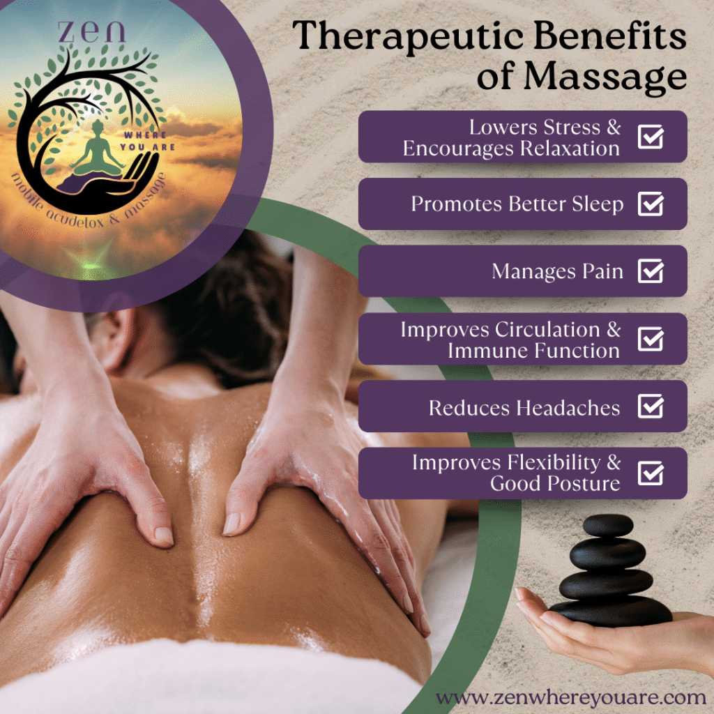 We recommend creating a comfortable space for your massage session. Ensure you have enough room (think twin size mattress for space comparison with the ability for your therapist walk around it) for our setup and we will discuss any specific preferences or concerns during the intake process. We ask for access to an outlet for music, hot stone warmer and lighting. Plan a time when your space is quiet so you can relax. At Zen Where You Are we love pets and they are welcome to stay in the space if you desire.